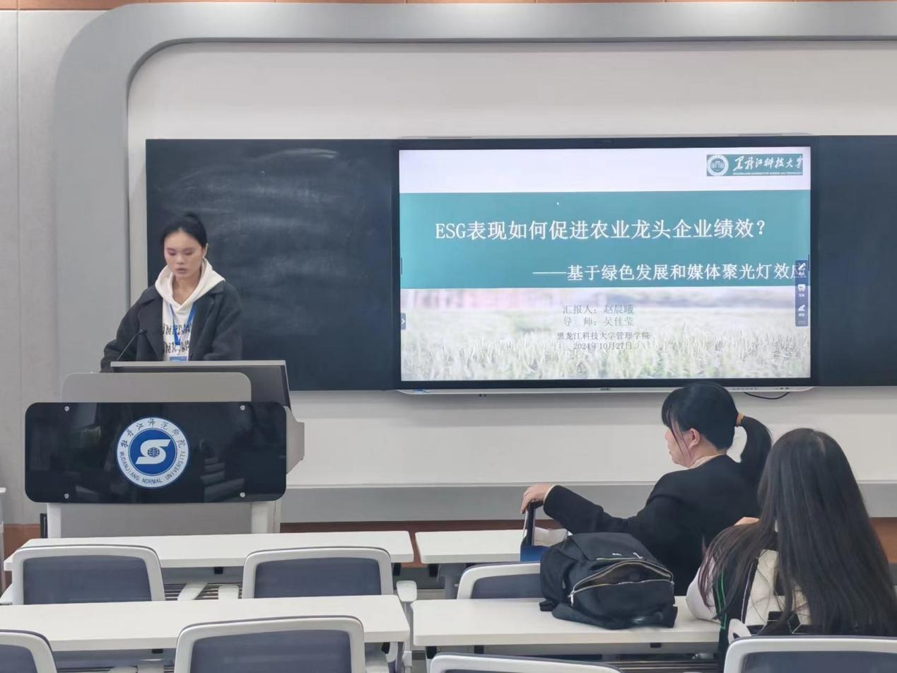 “数字赋能与智能决策”分会场报告环节,硕士生赵晨曦作了题为《ESG表现如何促进农业龙头企业绩效?——基于绿色发展和媒体聚光灯效应》的报告。报告指出加快建设农业强国是党的二十大以来的重要部署,绿色发展和媒体关注同样是建设现代化新格局的重要举措。探寻农业绿色发展是社会关注的重要课题。在媒体监督下,将ESG表现引入绩效影响研究,有助于促进发展方式绿色转型,加快新型农业产业化,推动农业高质量发展。