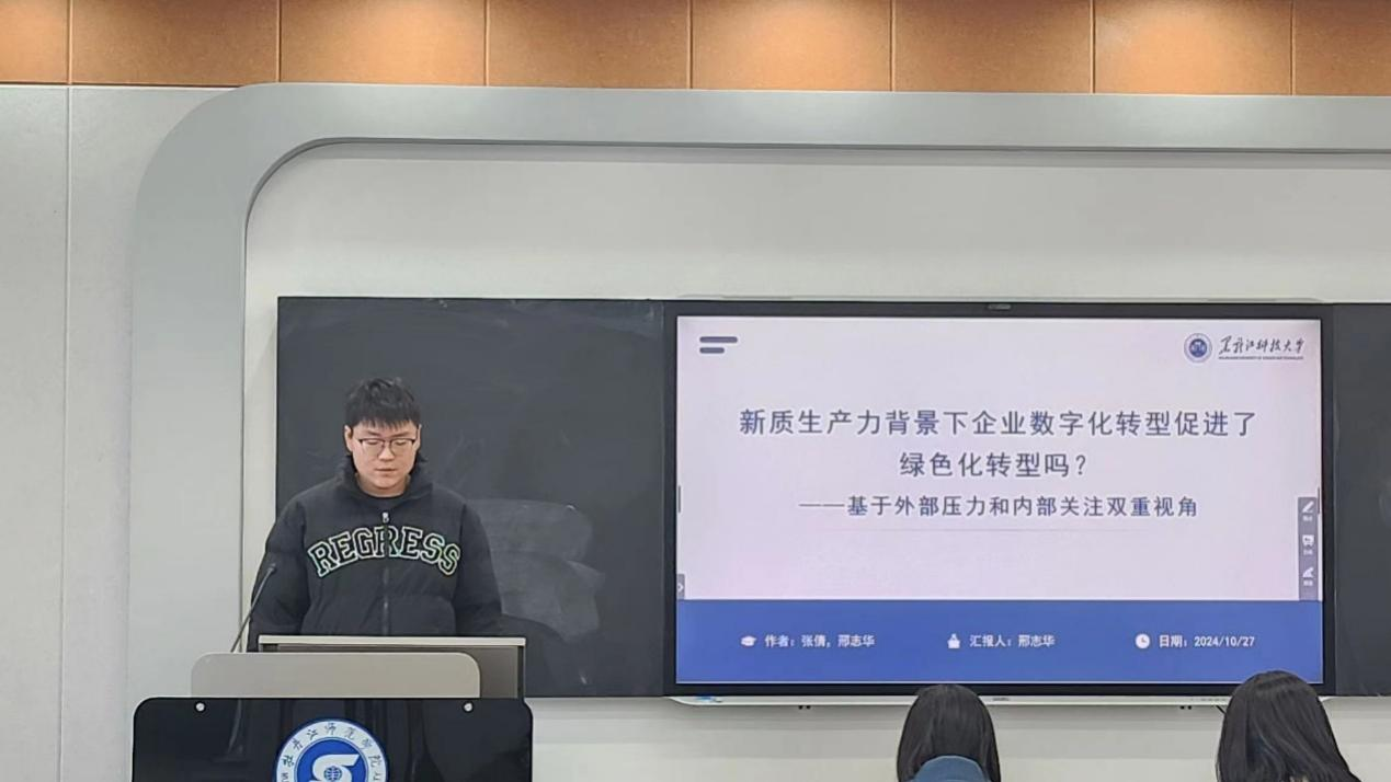 “新质生产力与高质量发展”分论坛报告环节,硕士生邢志华做了题为《新质生产力背景下企业数字化转型促进了绿色化转型吗?——基于外部压力和内部关注双重视角》的论文汇报。报告指出随着数字技术迅速发展和环境压力日趋严峻,以数字化转型带动绿色化转型是企业加快培育新质生产力和实现高质量发展的必由之路,企业数字化转型能够通过外部压力和内部关注双重渠道促进绿色转型,企业数字化和绿色化能够协同促进新质生产力发展。