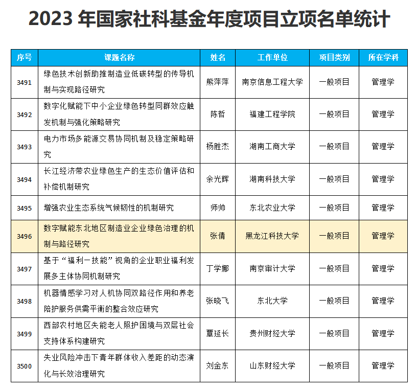 9月4日,全国哲学社会科学工作办公室公布2023年国家社科基金年度项目和青年项目立项名单,管理学院张倩教授科研团队申请的《数字赋能东北地区制造业企业绿色治理的机制与路径研究》获批国家社会科学基金一般项目。