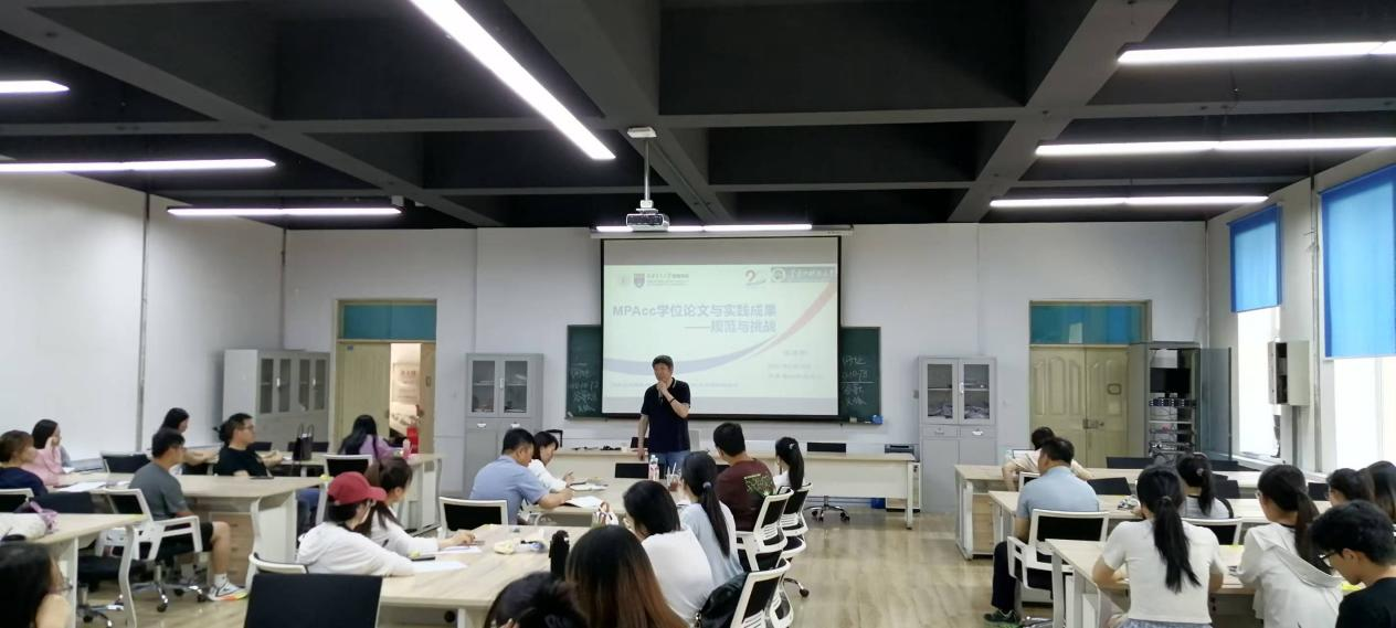 汪方军教授主要围绕学位论文(实践成果)的基本要求、会计专硕的重要性、学位论文(实践成果)写作的挑战、学位论文(实践成果)写作的应对四个方面进行讲述,重点阐述了不同类型学位论文的写作要求和规范。结合自身经验,向在座师生分享了优秀论文写作方法,强调了选题的重要性,指出MPAcc学位论文要以问题为导向,同时坚持理论与实践结合。