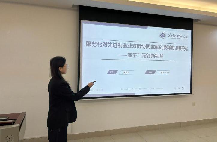 25 日下午,年会围绕 “新时代的科学学” 主题设置 50 个平行分会场。其中,王晓慧同学在第 46 分会场进行会议汇报,报告题目为《服务化对先进制造业双链协同发展的影响机制研究-基于二元创新视角》,中国科学院科技战略咨询研究院副研究员、中科院创新发展研究中心产业部主任乔为国、山东理工大学suncitygroup太阳集团薛凯超书记并对该报告进行点评。