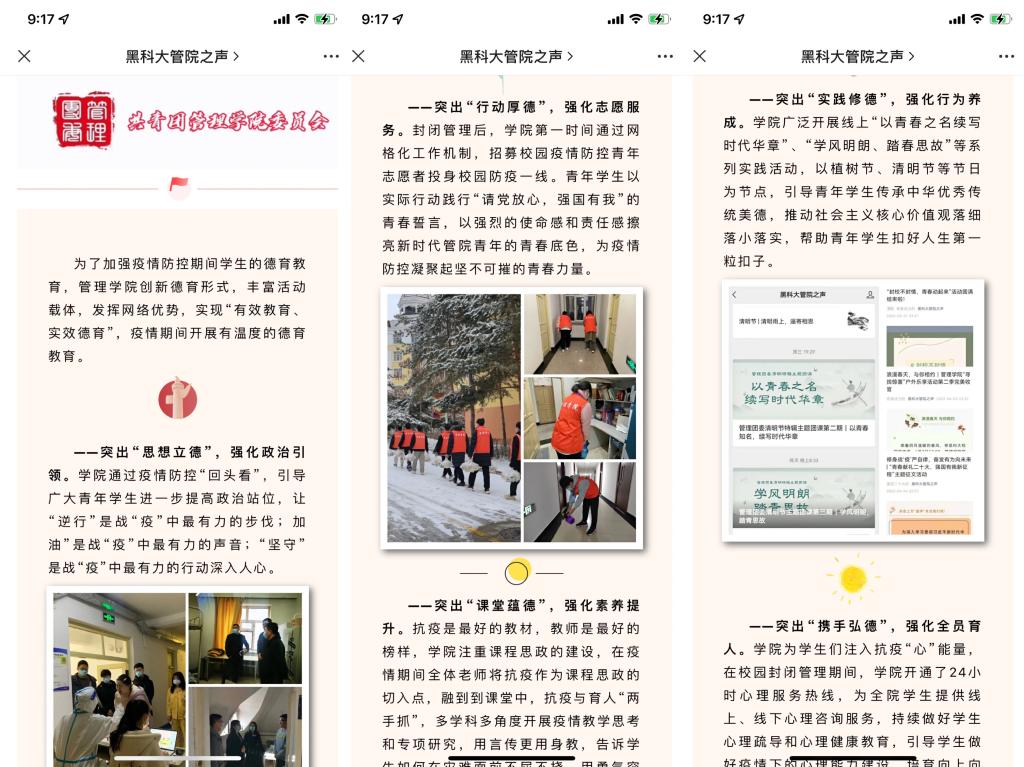 ——主题教育,抢抓道德陶养新机遇。在全民众志成城抗“疫”的伟大斗争,为德育工作提供了新的契机,同时也提出了新的要求。suncitygroup太阳集团以“价值观自信”为顶层设计,结合管理类毕业生的特点,通过实施“劳动教育”、“社会实践”、“家庭美德教育”、“网络思政”等协调育人模式,实现了德育、社会实践、传统文化等多维立体的互融互通。形成了“五个融合”的特色德育工作特点,即:德育教育与家庭美德教育相融合,突出“真情润德”,强化感恩教育,培养员工敬老爱亲、孝敬父母的美德,形成“学会知恩、心怀感恩、懂得报恩、善于施恩”感恩教育模式;德育教育与专业教育相融合,突出“课堂蕴德”,强化素养提升,培养员工敬业、诚信、公正、坚守底线的商业伦理与职业道德,形成“四年不断线”的德育教育模式;德育教育与劳动教育融合,突出“实践修德”,强化行为养成,劳动淬炼培养大学勤劳行为,形成“以雪为令、雪停路净”的劳动教育模式;德育教育与志愿者服务相融合,突出“行动厚德”,强化志愿服务,形成“走出去与请进来同步同行”的志愿服务模式;德育教育与文化教育融合,突出“书香养德”,强化人文素养,形成“传统文化与新思想高度契合”的文化艺术节和“管院之声”网络思政品牌。