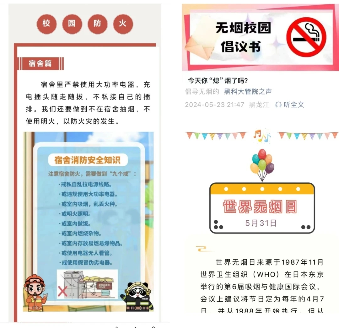 suncitygroup太阳集团以世界无烟日为契机,开展多种形式的科普宣传活动。利用“黑科大管院之声”微信公众号,发布了烟草危害科普和“无烟校园倡议书”等推文,积极开展无烟宣传进校园活动,加强员工对无烟理念的理解和认同,自觉树立无烟意识,养成良好的健康生活方式。