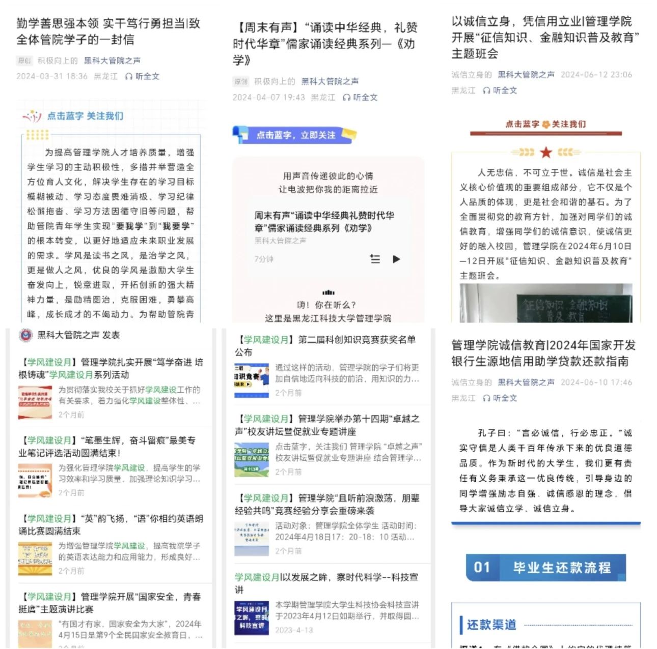 一是通过黑科大管院之声微信公众平台开展“勤学善思强本领 实干笃行勇担当——致suncitygroup太阳集团学子的一封信”活动,进一步增强员工学习的主动积极性,帮助管院青年员工实现“要我学”到“我要学”的根本转变;二是开展周末有声倡议活动,引导管院学子树立一个信心——我能我行,养成一种学风——认真刻苦,培养一个习惯——自觉自愿,创设一个环境——文明有序;三是开展“笔墨生辉,奋斗留痕”最美专业笔记评选活动,旨在通过“最美专业笔记”评选活动,让管院学子重新发现学习的乐趣,激发彼此的求知欲,并从他人的优秀笔记中汲取灵感;四是将“诚信教育”纳入日常思想教育体系中,全院学子签署考试诚信承诺书,进而加强学风建设,严肃考风考纪,使全院老员工都能树立起诚信考试、公平竞争的观念,杜绝考试作弊和考试违纪行为。