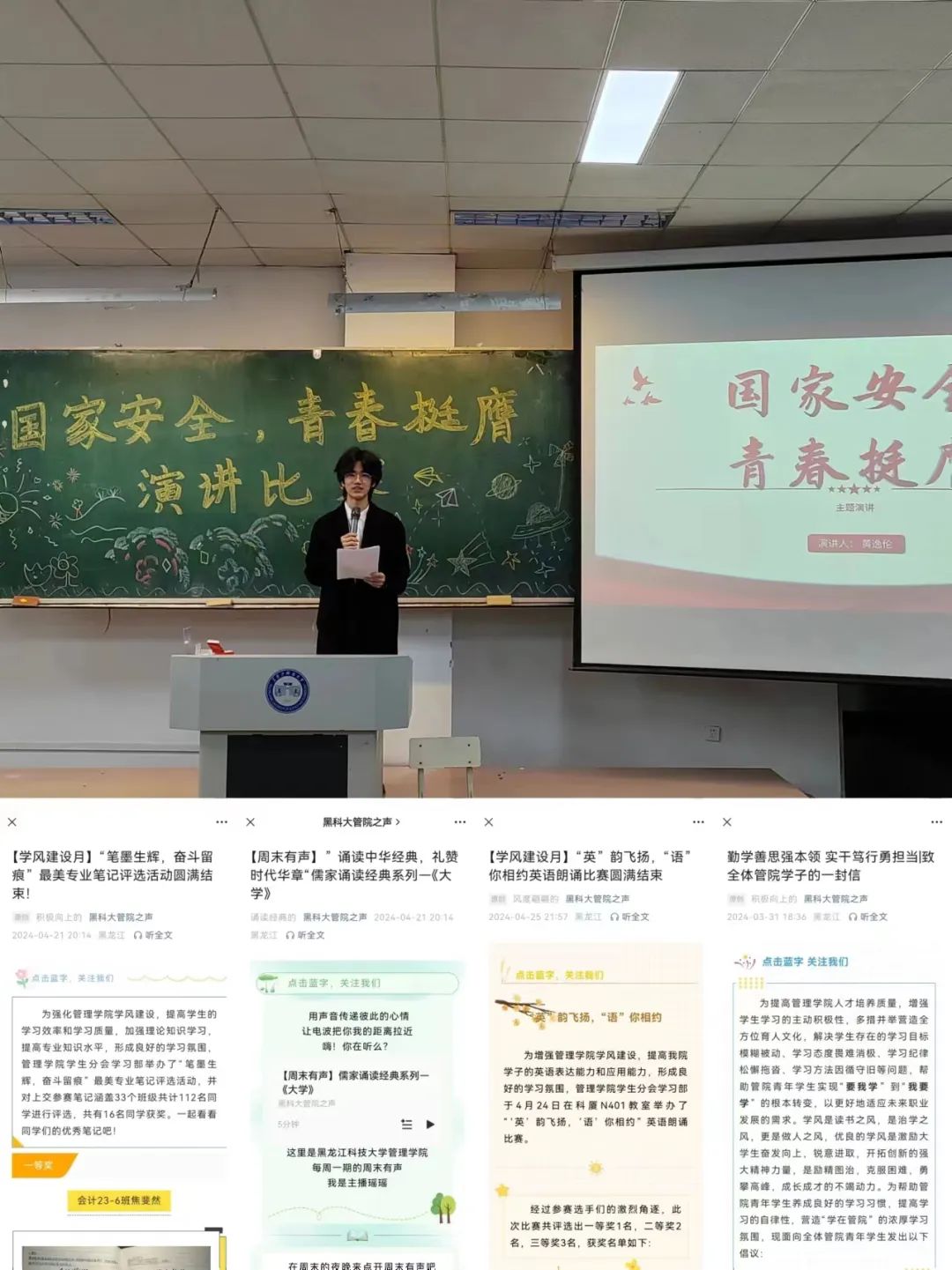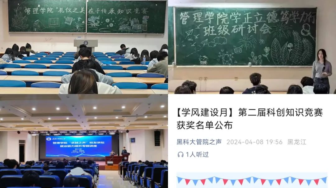 以学风氛围为基础,打造优良环境。公司开展“学正立德 笃学力行”主题团活、“礼仪之美,在于传承”老员工知识竞答活动、第二届科创知识竞赛、第十四期“卓越之声”员工讲坛暨促就业专题讲座等活动,从团活入手,着力促进管院学子全面成长;通过黑科大管院之声微信公众平台,面向全体管院学子发出“勤学善思强本领 实干笃行勇担当”学习倡议书,倡导管院学子实现从“要我学”到“我要学”的根本转变,养成良好的学习习惯,提高学习的自律性,在砥砺前行中收获美好的青春诗篇。