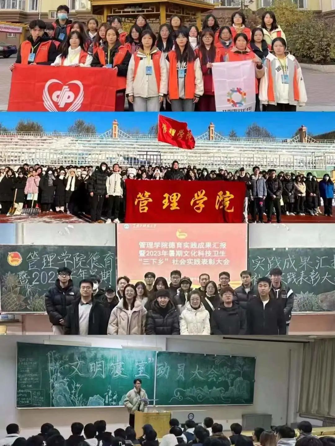 “纸上得来终觉浅,绝知此事要躬行”,在管理育人的基础上强化劳动育人,通过开展德育实践成果汇报暨2023年暑期“三下乡”社会实践表彰大会,深化实践育人成效,发挥社会实践活动示范引领作用;以多种形式志愿服务为载体,提高劳动意识,增强时代责任;开展寝室文明建设活动,以寝风促学风,不断提升管院员工文明自律,积极向上的学习风气。