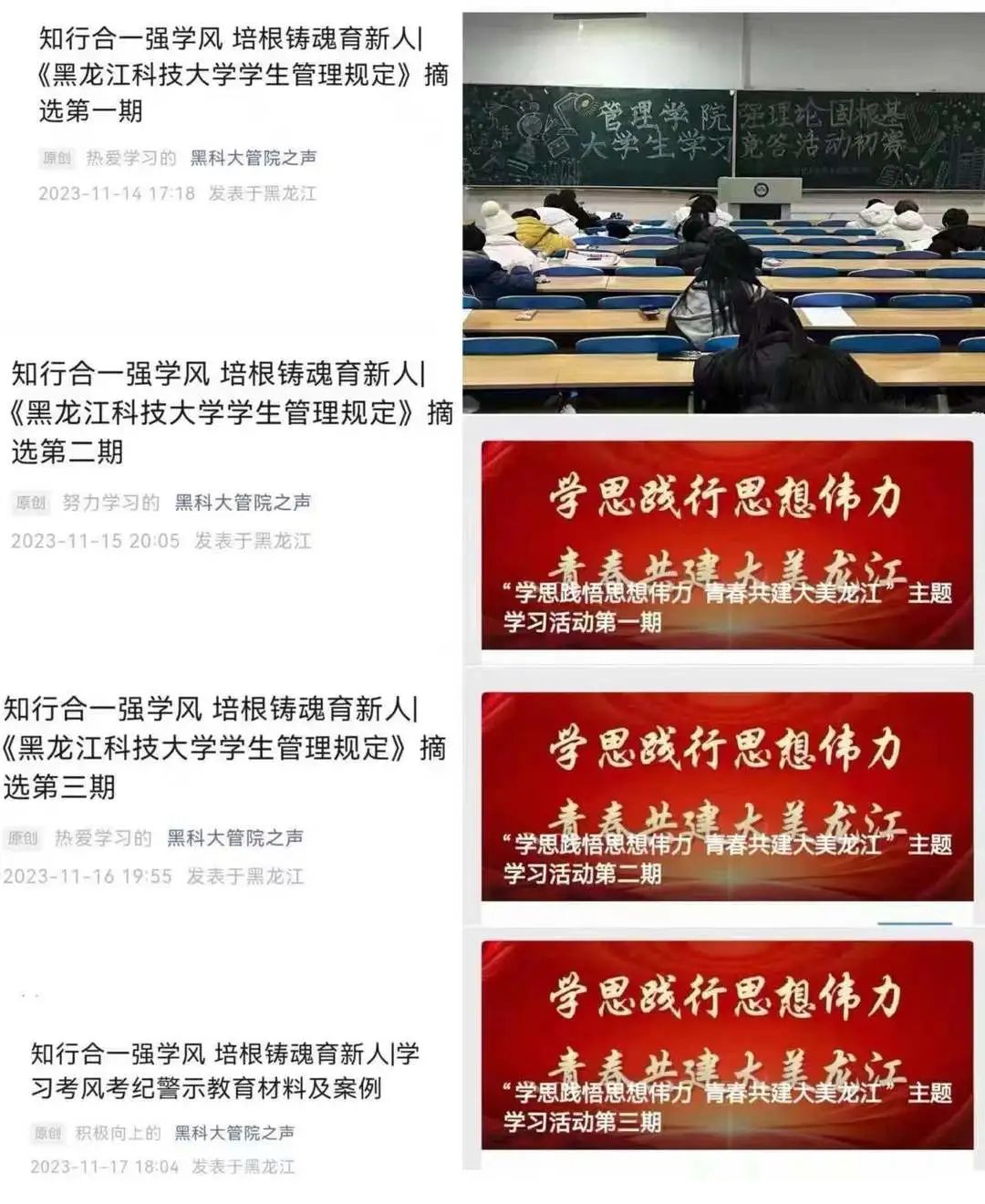 组织开展形式多样的主题思想教育活动,引导和鼓励员工坚定理想信念,锤炼品格修养。利用“管院之声”网络思政阵地,强化思想引领,引导员工认真全面学习习近平总书记在黑龙江省视察、主持召开新时代推动东北全面振兴座谈会时的重要讲话重要指示精神,在学思践悟中感悟思想伟力,以青春之我共建大美龙江;开展考风考纪警示教育系列活动,提高员工的规矩意识,守住底线思维。