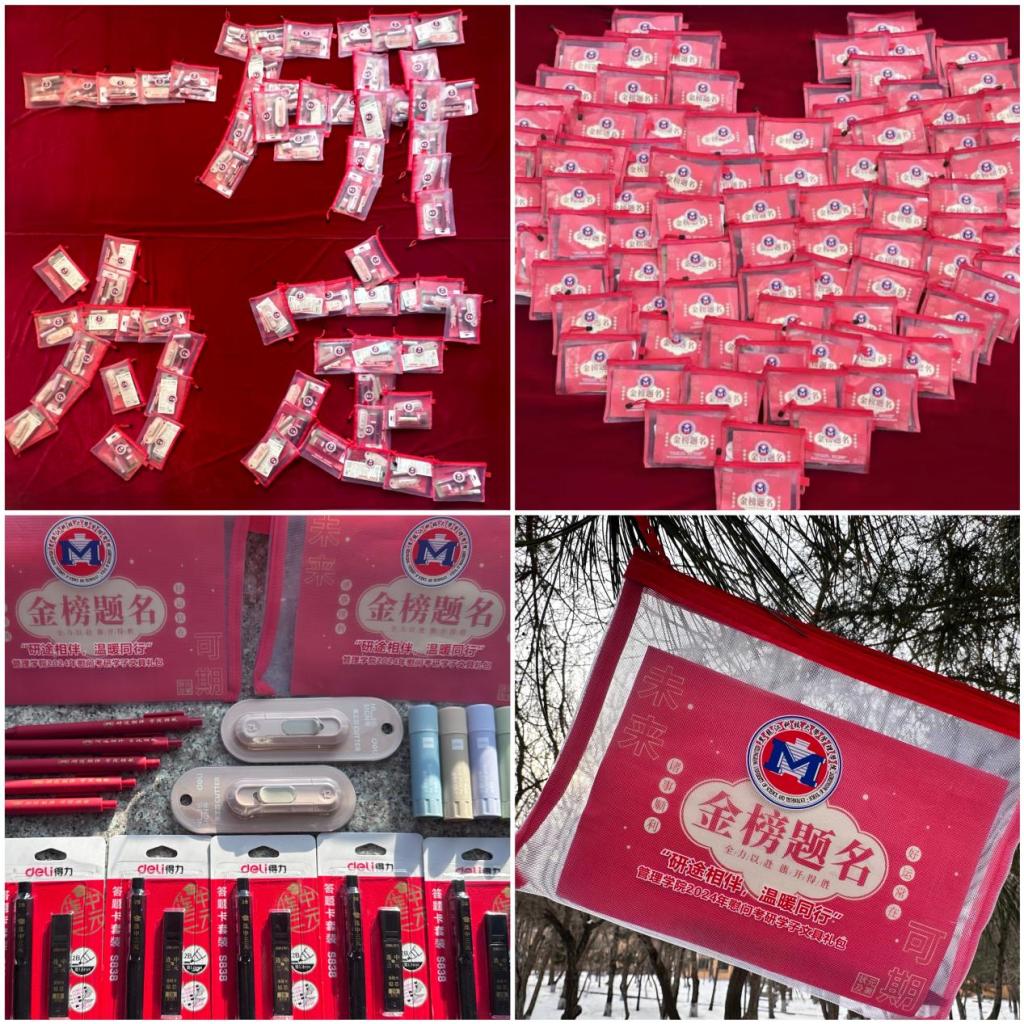 礼包中,每一份礼物都有着特别的寓意,饱含着“温暖”:定制文具袋上印有“‘研’途相伴,温暖同行”字样,为管院学子“研”梦护航,寓意着学子们能将毕生所学悉数装进这袋中,考场上落笔有神助,如愿以偿,金榜题名。文具套装(涂卡铅笔、铅芯、2B橡皮、拆卷小刀、固体胶)实用相伴,寓意妙笔生花,笔锋不停,助力学子分秒必争,稳步前行。红壳中性笔上印有“‘研’途相伴,管院领航”字样,寓意“红”运当头,笔下流转“红”运,大展“红”鹄之志。助力学子们用智慧书写人生底色,以坚韧描绘前行轨迹。