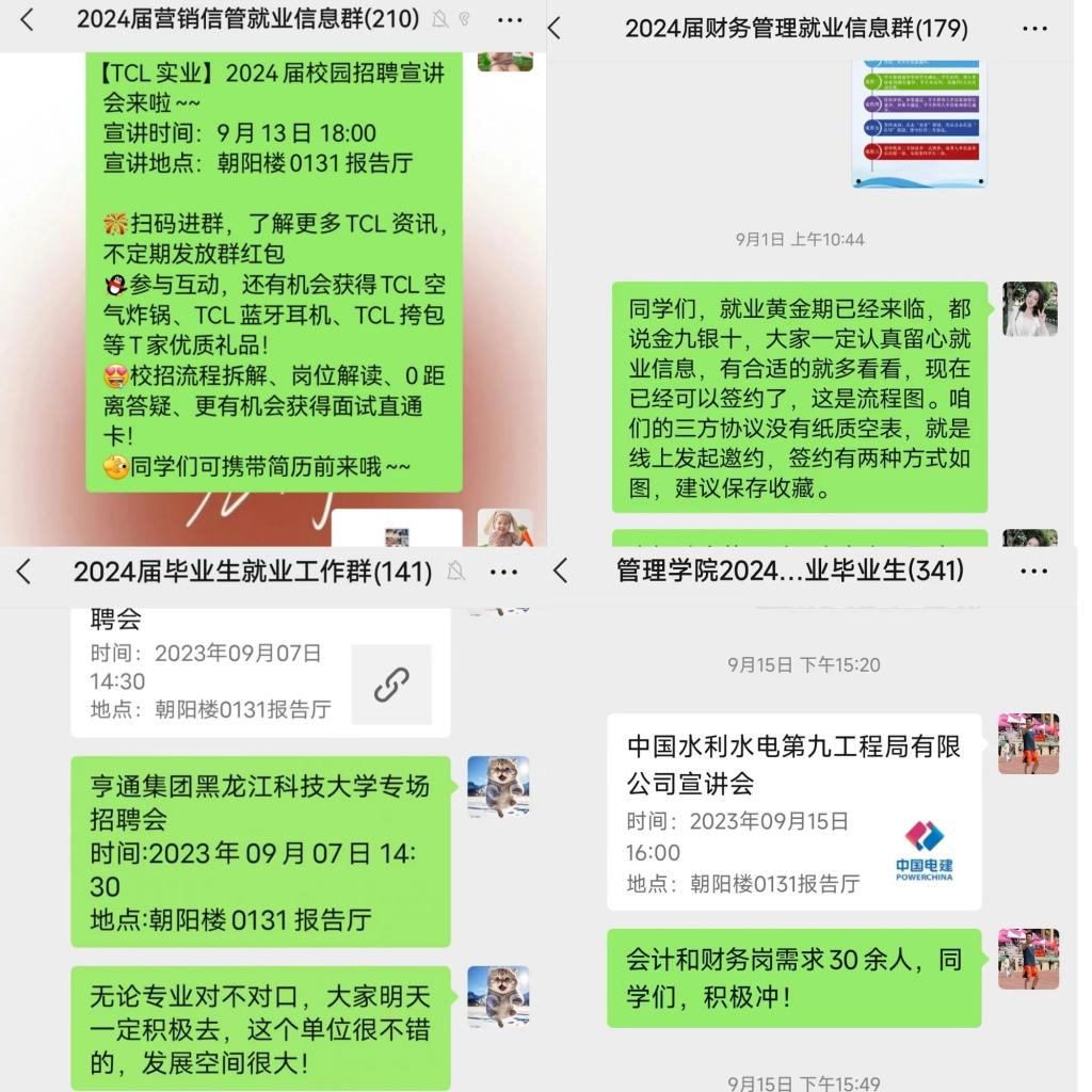 畅通信息渠道,在“活”字上下功夫。毕业年级辅导员、班主任分辖区分专业召开就业动员大会,鼓励员工树立正确的就业观念,积极调整就业心态,抢占就业黄金期,先就业再择业;充分运用好“互联网+就业”的特征优势,分专业建立2024届毕业生就业信息微信群、及时分类精准推送就业信息,确保“服务指导不打烊,岗位推送不停歇”,让毕业生能感受到学校、师长的亲切关怀。