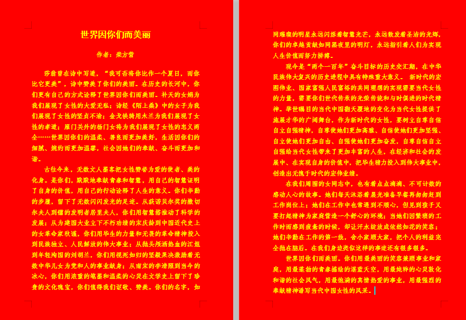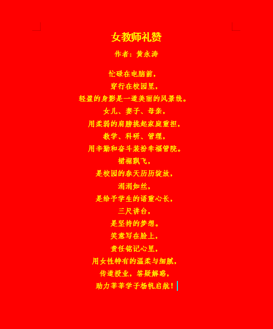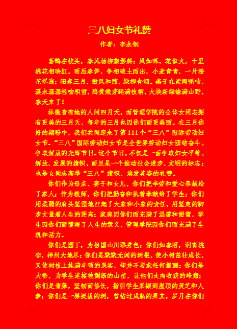 虽时处疫情防控常态化,但并不能阻止我们对美好生活的追求。学院用征文礼赞这种别样的方式,展现了学院全体教职工积极向上、充满正能量的精神风貌。全院教工参与积极,倾情诠释,用笔尖书写了对伟大女性和庆祝建党百年的挚爱。本次征文比赛共征集到83篇来搞,篇篇全面而又真诚地抒发了对全院乃至全校女教工的尊重与敬爱,讴歌了广大女教工的岗位实绩与价值追求。(部分优秀征文节选如下)