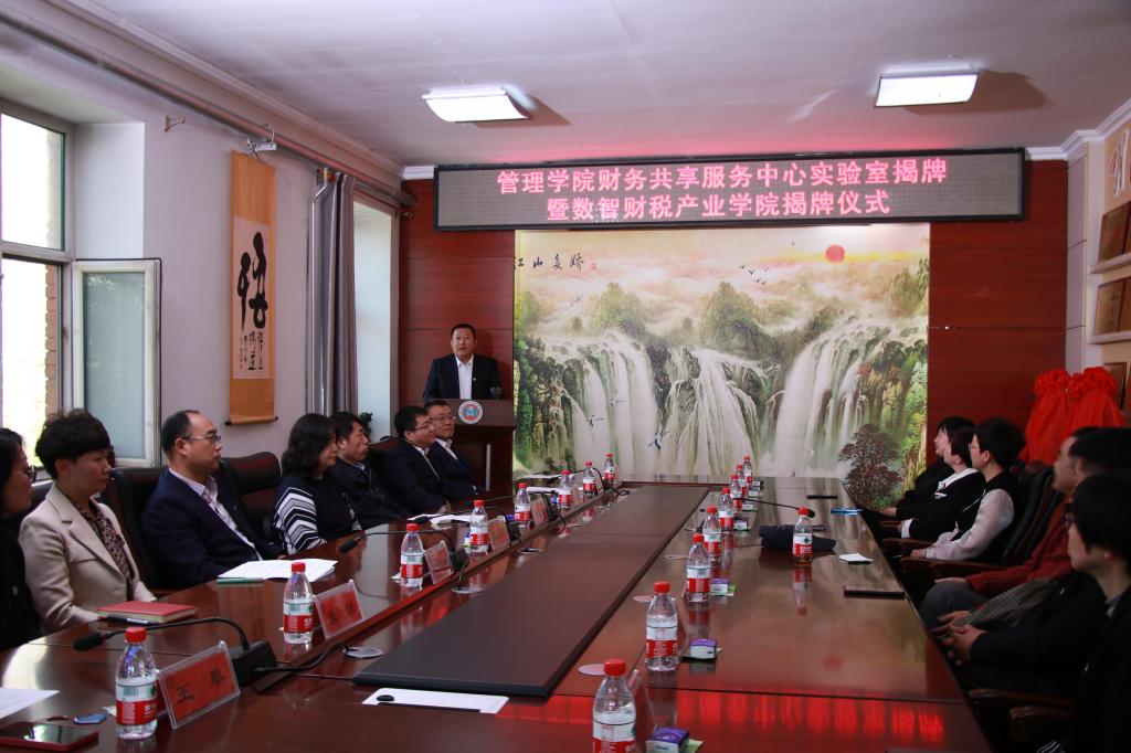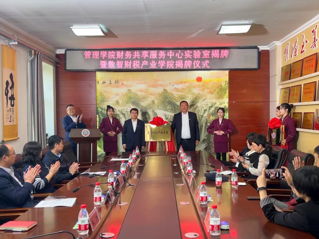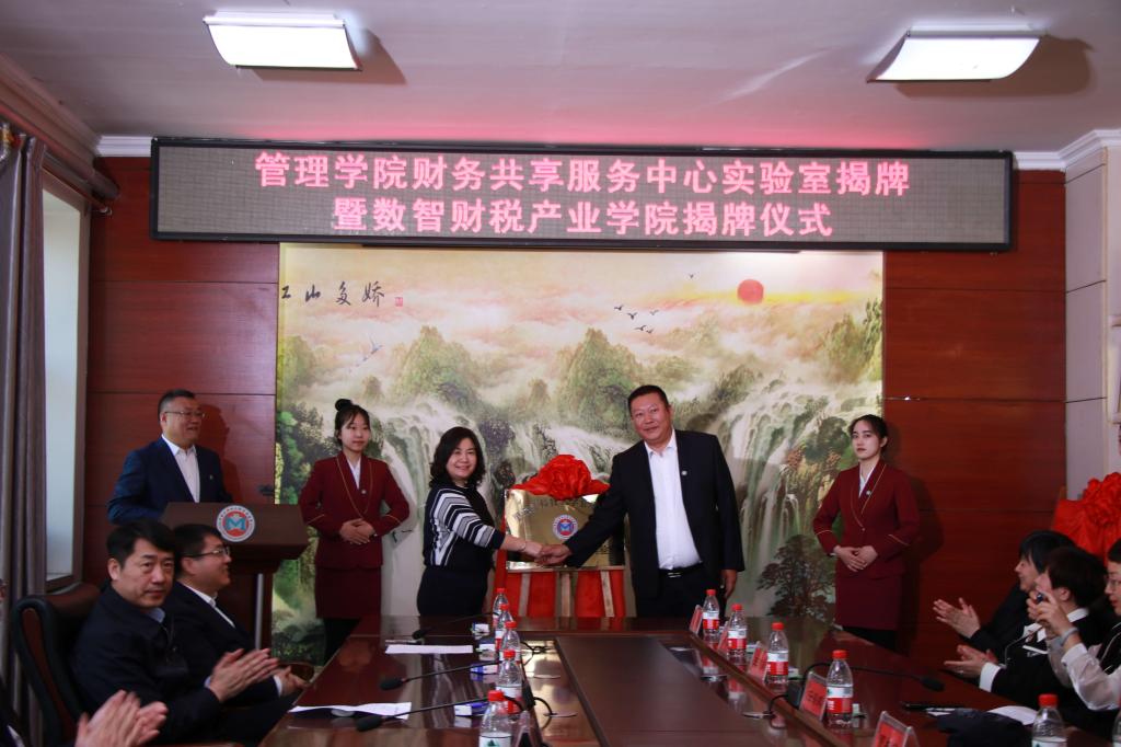 副董事长谭旭红、suncitygroup太阳集团副经理洪亮分别和黑龙江航天信息有限公司总经理任海鹏为“财务共享服务中心实验室”和“数智财税产业学院”揭牌。