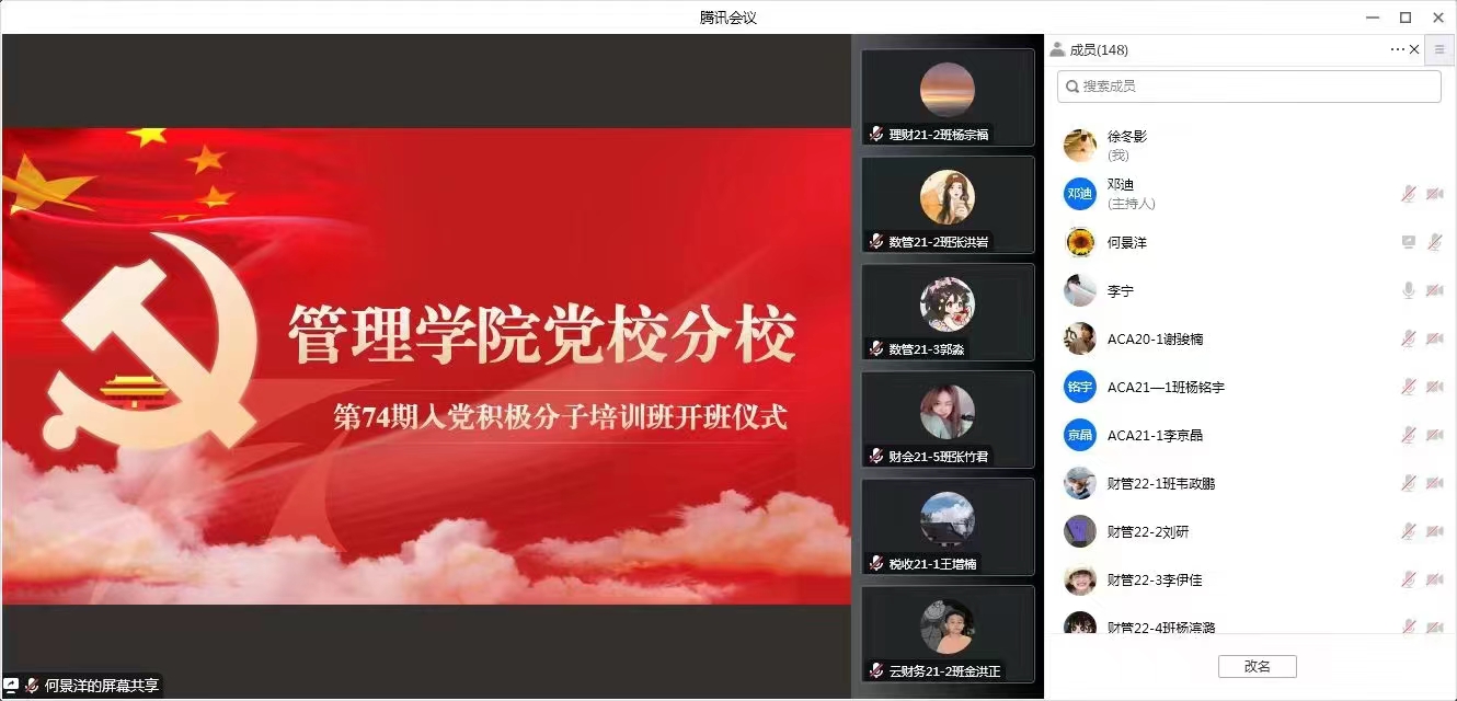 为加强党的基本理论知识教育,根据《中国共产党发展党员工作细则》和公司党校分校关于积极分子培训班的有关规定,学院于11月1日通过线上的方式举办了第74期积极分子培训班开班仪式。公司党委书记何景洋、培训班班主任2019级辅导员徐冬影和本期144名入党积极分子共同参加了仪式,本次开班仪式由公司党委委员、学工办主任李宁主持。