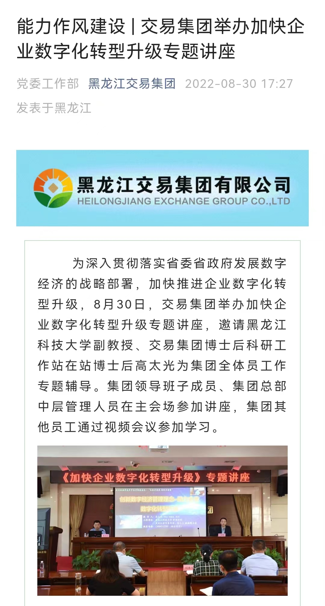 公司高太光博士为黑龙江省交易集团作企业数字化转型专题讲座