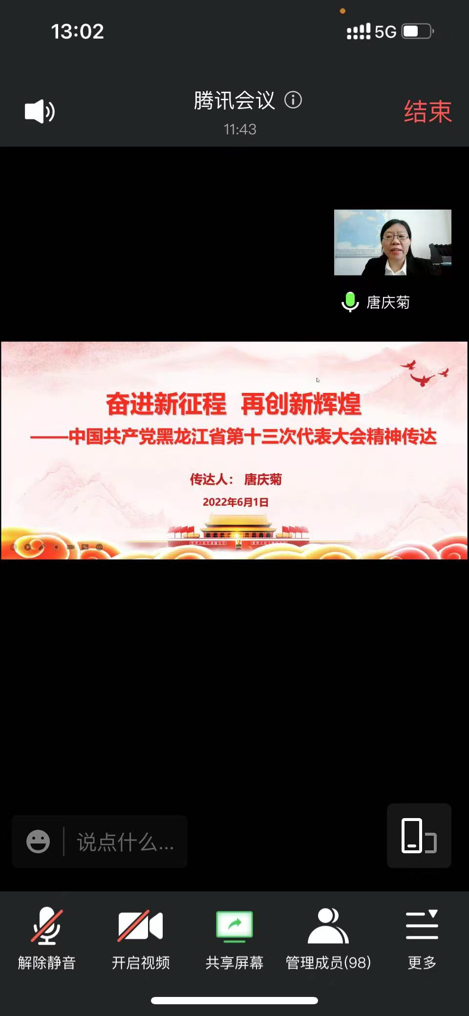 会上,唐庆菊教授以《奋进新征程,再创新辉煌》为题,围绕省第十三次党代会的基本情况、参会感受、党代会精神等三个方面,做了一个高度凝练、重点突出、内涵丰富的学习辅导报告。她以“1841696”数字为线索,带领与会同志认真回顾了大会主题和过去五年取得的8方面重要成绩;以“四个必须”、未来五年的总体要求、建设“六个龙江”为主线,引领与会同志深入理解始终沿着习近平总书记指引的方向勇毅前行,以坚定信心和昂扬斗志再创龙江新辉煌的方向和内容,提振干事创业的信心;以“九个坚定不移”的重点任务深刻解读奋力推进全面振兴全方位振兴开创新局面的具体部署;以全面加强党的建设的“六个切实”,阐释在新的赶考之路上展现新作为的明确要求。