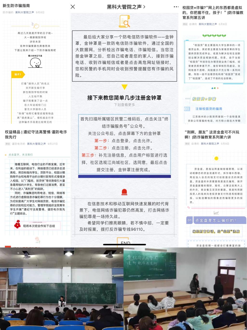 ——广宣教,主动占领各种教育阵地。在反电信网络诈骗方面,suncitygroup太阳集团始终坚持教育为主、预防为先的工作原则,采取各种有效宣传方式,多渠道、全方位营造反电信网络诈骗浓厚氛围,努力做到宣传教育全员覆盖。在新生入学前,学院通过各种渠道进行反电信网络诈骗重要提醒;入学后,学院将反电信网络诈骗作为“开学第一课”的重要内容,通过主题班会的形式向全体同学进行宣讲,通过“管院之声”官方微信宣传,班级微信群、QQ群推文,主动占领员工课堂、公寓和网络教育阵地。