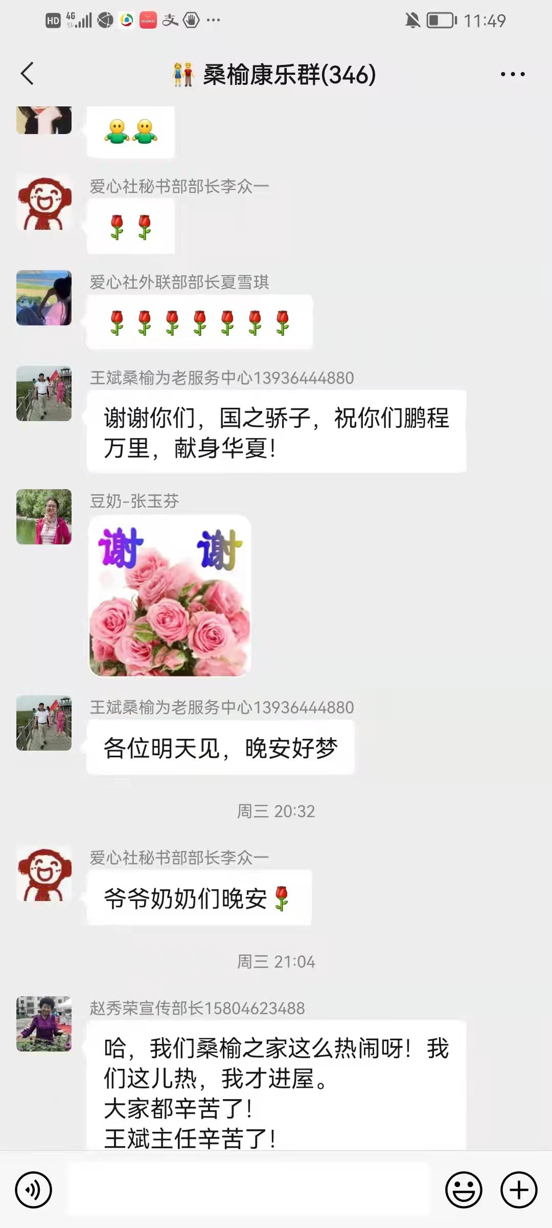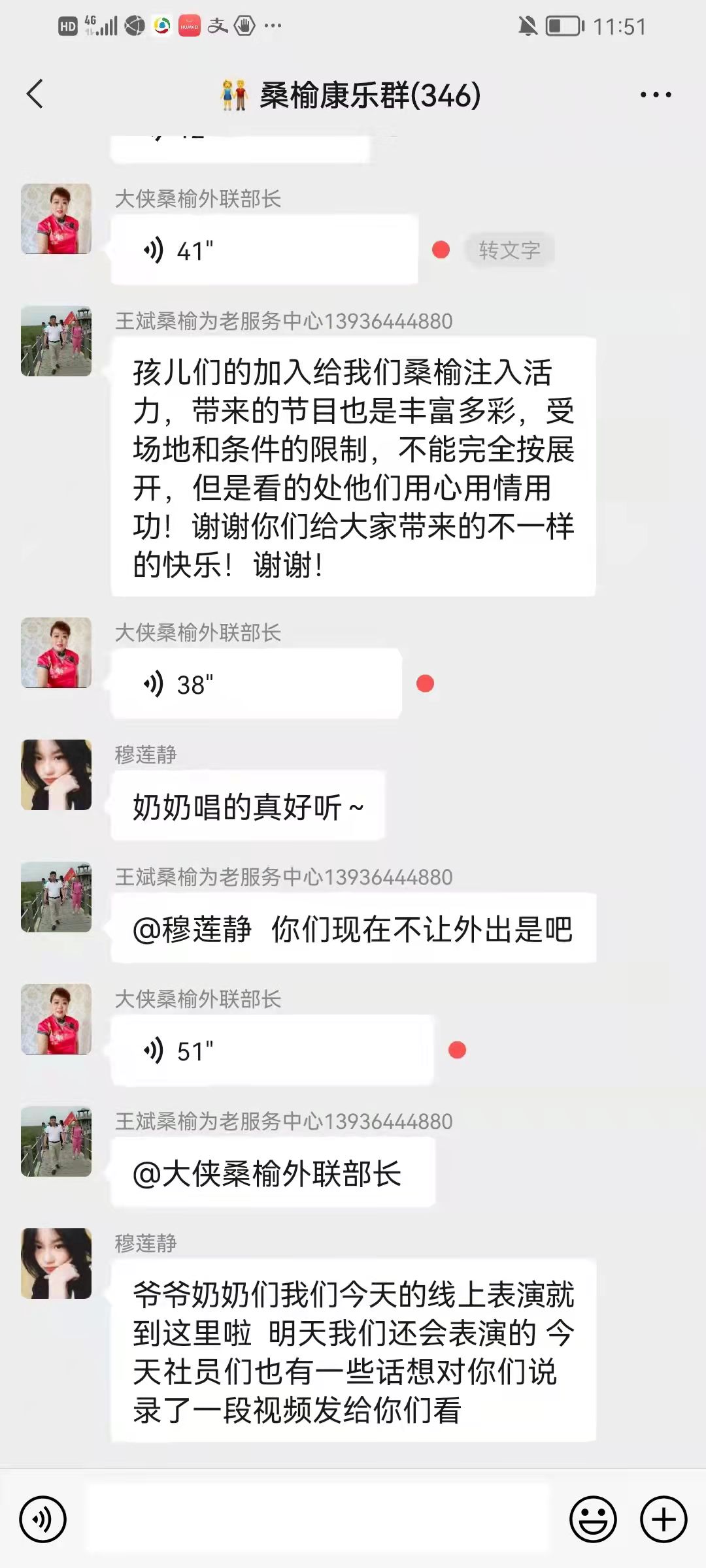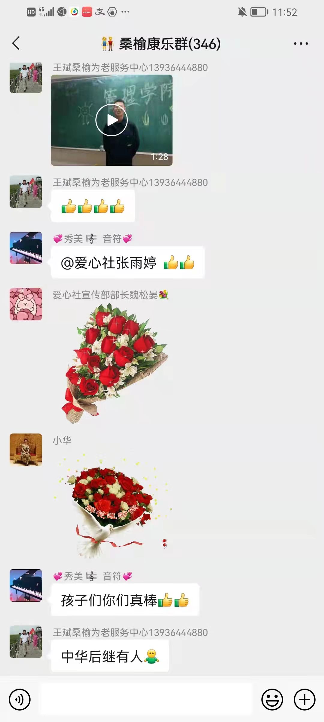 为了缓解他们居家期间情绪紧张的问题,爱心社的同学们以微信群内线上联欢的形式,录制了《太阳照常升起》口琴独奏等7个精彩的小节目,在员工们的带动下,群里的老人纷纷献唱《我和我的祖国》等歌曲,一同为祖国庆生。这种线上支持缓解了社区老人的心理压力,他们居家抗疫带来了欢声笑语。最后员工们录制了一个送出祝福的集体视频,把美好的祝愿送给了老人们,为这次线上服务画上了完美的句号。两天共服务7个小时,累计服务638人次。这次线上服务把抗击疫情必胜的信心带给了老人们,也体现了公司老员工的责任感和精神风貌。