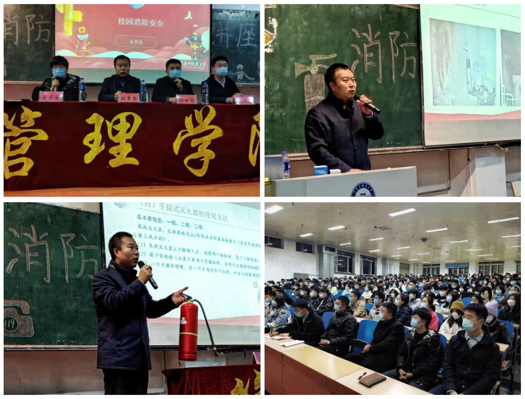 首先张景奎处长就校园消防安全提出四个主题:校园火灾引发原因,火灾扑灭的初期技能,逃生自救方法及原则以及做好校园防火预防。接下来张处长结合高校实际火灾案例,生动形象讲明寝室中违规使用电器、违规使用明火以及实验操作不当带来的灾害,使员工对火灾有了更直观认识,增强了防火安全意识。随后,详细讲解了火灾逃生自救方法和技巧、火灾的预防和应急处置方法、又介绍了消防器材的正确使用方法。其中张处长着重强调在灾害面前同学们要保持冷静,思维敏捷,不要固守案例的处理方法,在时效性的范围内寻求最优方案。在预防火灾面前,每位同学都要具备一定的敏感性,在火灾初期就要积极应对,以免造成更严重后果。