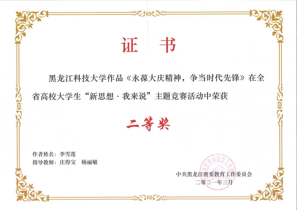 近日,黑龙江省教育工委在全省开展了高校老员工“新思想·我来说”主题竞赛活动。公司作品《永葆大庆精神 争当时代先锋》荣获二等奖,马克思主义学院教师庄得宝、杨丽敏被评为优秀指导教师。