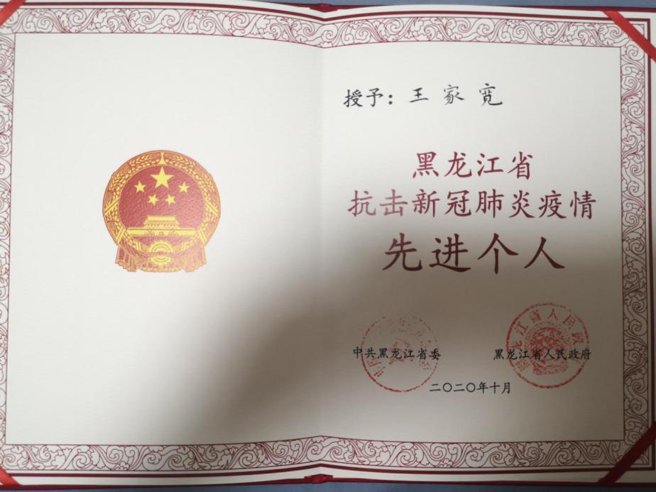 公司2018级MBA研究生王家宽荣获“黑龙江省抗击新冠肺炎疫情先进个人”荣誉称号