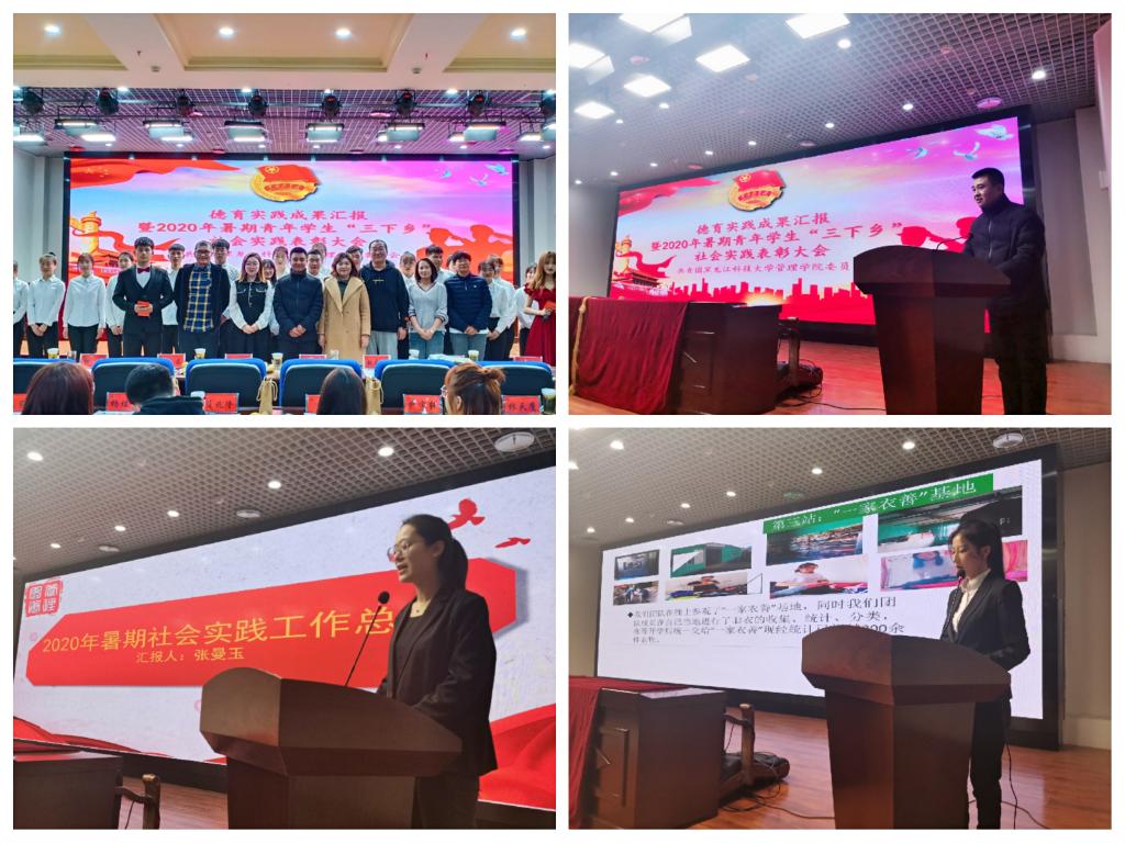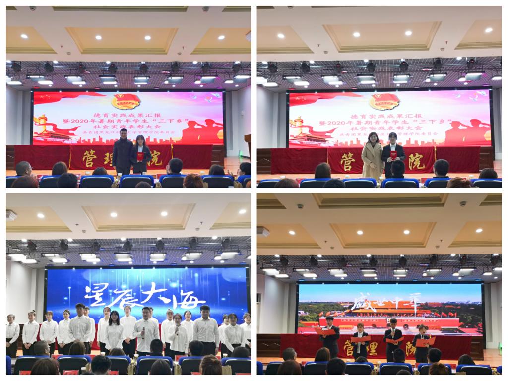 表彰大会在雄壮的“光荣啊,中国共青团”的歌声中拉开序幕。与会人员共同观看了个人社会实践和团队社会实践的视频集锦,共同回顾了暑期社会实践的精彩瞬间;学院团委副书记张曼玉宣读了《suncitygroup太阳集团2020年暑期社会实践总结报告》和《关于表彰2020年暑期青年员工“三下乡”社会实践优秀团队、优秀个人的决定》;与会领导及嘉宾分别为受表彰的团队与个人优秀代表颁发证书;优秀社会实践代表财会18-6班团支部林佳音与大家共同分享在社会实践过程中的做法、经验和感悟。suncitygroup太阳集团此次社会实践优秀作品多,实践质量高,其形式多样、内容新颖,展示出了管院社会实践的规模与特色,舞蹈《无价之姐》、朗诵《大写的中国》与歌曲《星辰大海》将表彰大会的气氛逐步推向高潮。