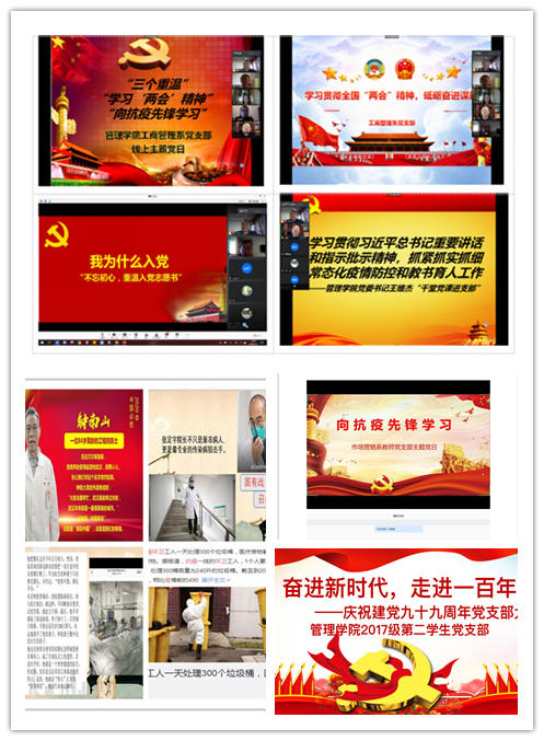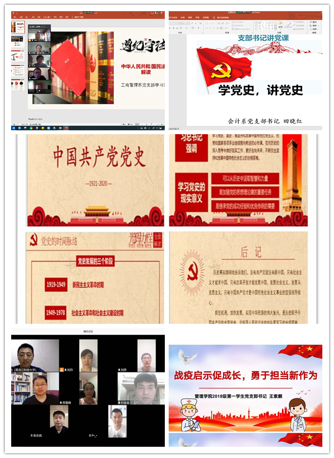 主题党课云端开讲,在线上加强思想引路。各党支部书记结合本支部实际情况,自选主题紧密围党史发展脉络、疫情期间党员担当以及走近《民法典》等深刻主题,进行了深入浅出的讲解,同时结合当前的社会舆情和国际国内形势,增强了广大师生对党的感情认同、理论认同和政治认同,教育引导师生党员涵养政治素质,坚定政治信仰,在学习党史上的先进典型时,也激发了全体师生党员保持和发扬改革时期的创新精神,从而增强师生党员继承和发扬党的优良传统和优良作风的自觉性。