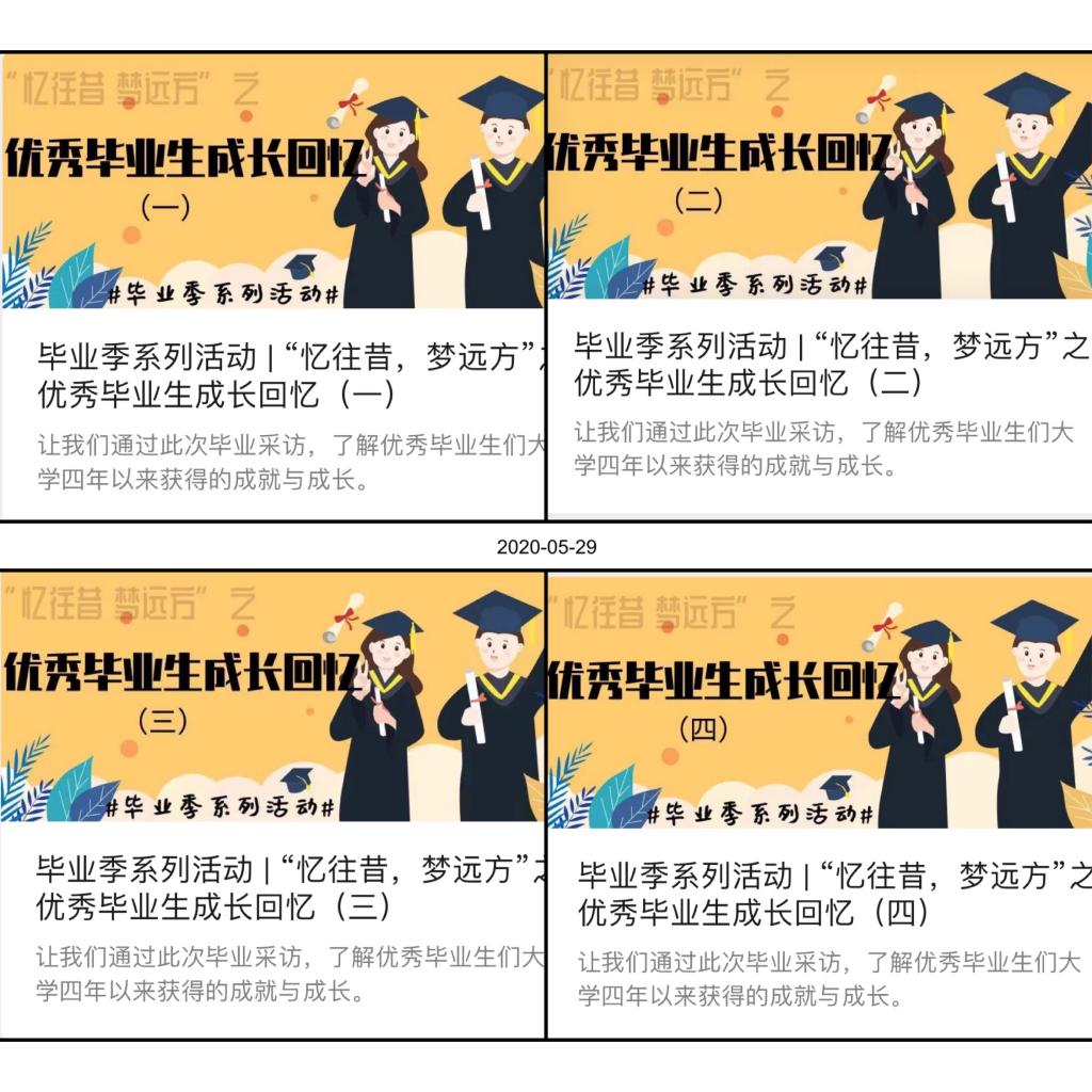 由员工分会海纳主持人团的小记者们通过微信,QQ等线上方式与公司多名优秀毕业生代表取得联络进行线上“云”采访。采访分为四个篇章分别选取了四个方面典型代表,分别为:学风建设——考研典型脚踏实地——就业典型勤勉尽责——员工干部典型以及无私奉献——志愿服务典型。优秀毕业生们从自己四年来的成长经历、收获感悟、学习方法、就业经验等方面学弟学妹们提出了中肯的建议和鼓励。通过他们的经验分享,我们了解到每一份奋斗背后的付出和辛苦,感受到毕业生们对于学校的深厚感情和浓浓不舍同时也引导管院所有在校生向榜样看齐,向优秀致敬。