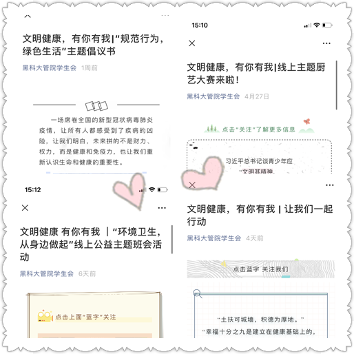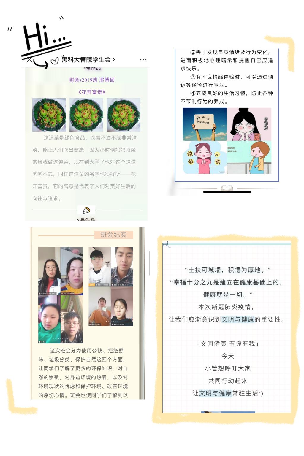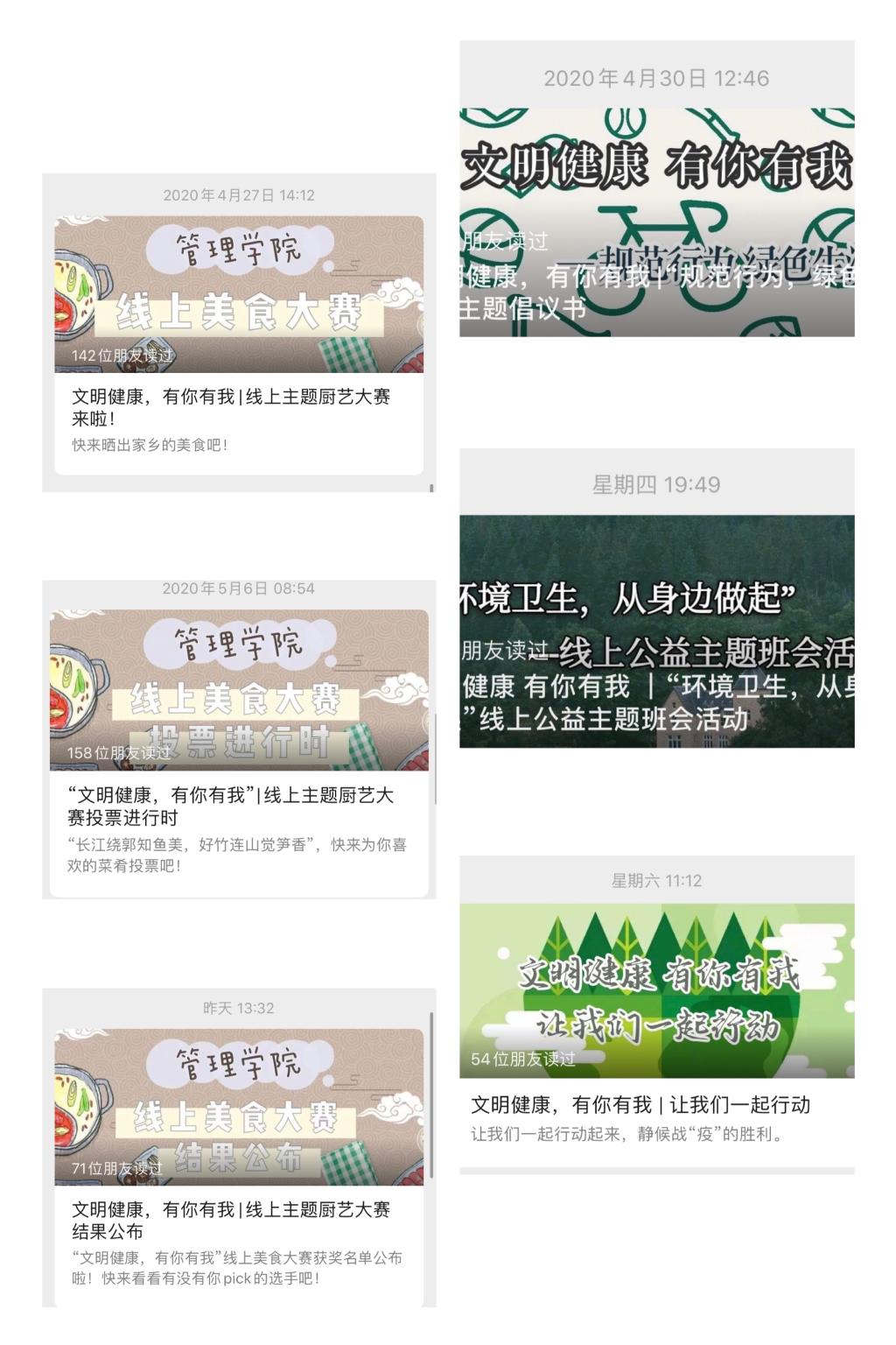 本次系列活动的顺利开展在深入贯彻绿色环保理念的同时充分夯实管院员工文明健康教育工作的基石带动管院学子提升自身修养加强理论学习,将文明健康绿色环保的意识自觉牢固于心,外化于行。生逢其时,重任在肩,此次活动为管院全体员工助力抗取得最后胜利打下思想强心剂的同时更加坚定了管院学子以爱国、励志、求真、力行书写青春之歌的豪迈信念!
