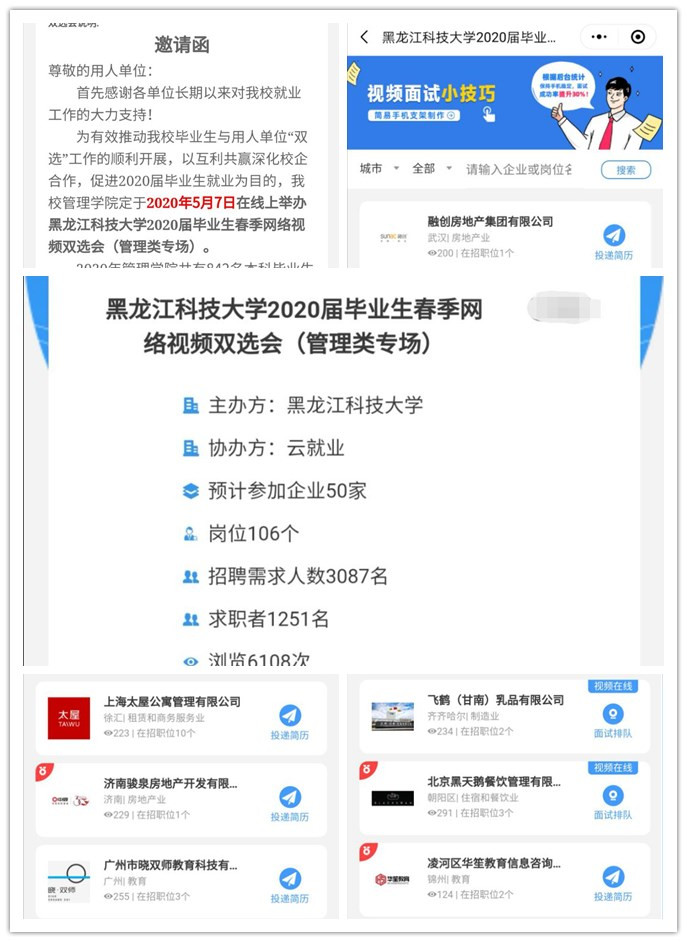 为了深入贯彻落实学校4月27日下发的《suncitygroup太阳集团2020届毕业生就业工作管理办法》文件精神,suncitygroup太阳集团于5月7日上午9点,利用云就业平台召开网络视频春季双选会(管理类专场),邀请了省内外50家优质招聘单位参会,提供就业岗位106个,用人需求达到了3087名,吸引了包括342名本校管理类毕业生在内的1251人参会,员工总浏览量达到了6108次,取得了良好效果。