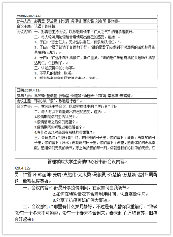 人心齐,泰山移。这是铿锵有力的中华誓言,更是历久弥新的中国力量。在灾难和困难面前,在这次疫情面前,凝聚的人心才是最强大的力量。管院资助中心组织在疫情期间坚决响应党中央的号召,我们相信团结一致是战胜疫情最有力的抗疫武器。