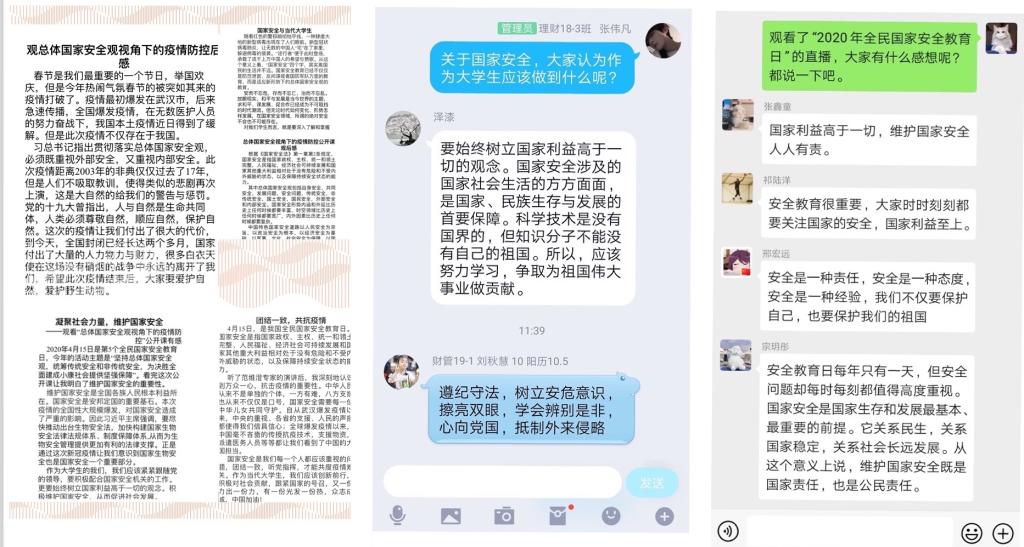 利用线上平台组织全院员工开展答题活动,针对国家安全问题展开讨论,鼓励全院师生“多渠道、多手段、多方式”及时展现相关学习成果,师生们积极参加,各抒己见,表达自己的想法。纷纷表示本次活动提升了大家的国家安全法治意识,有效增强了防范和抵御安全风险的能力,会一直以国为荣,自觉维护国家安全,敢于同各种危害国家安全的不良行为作斗争,做祖国的忠诚卫士。