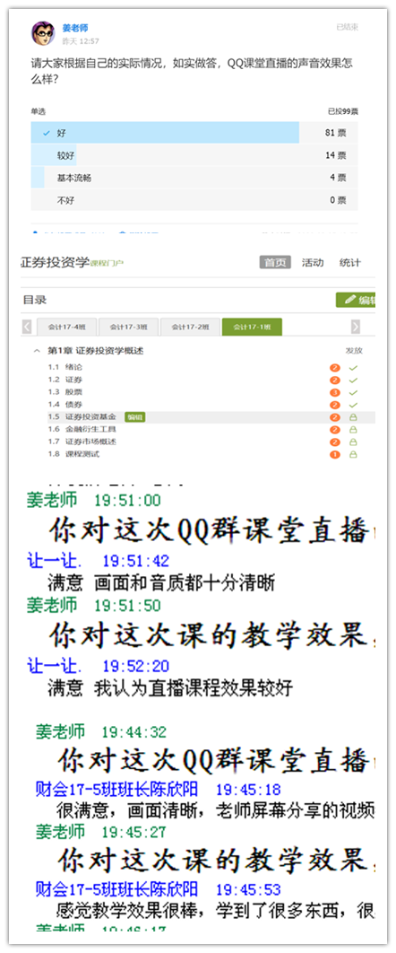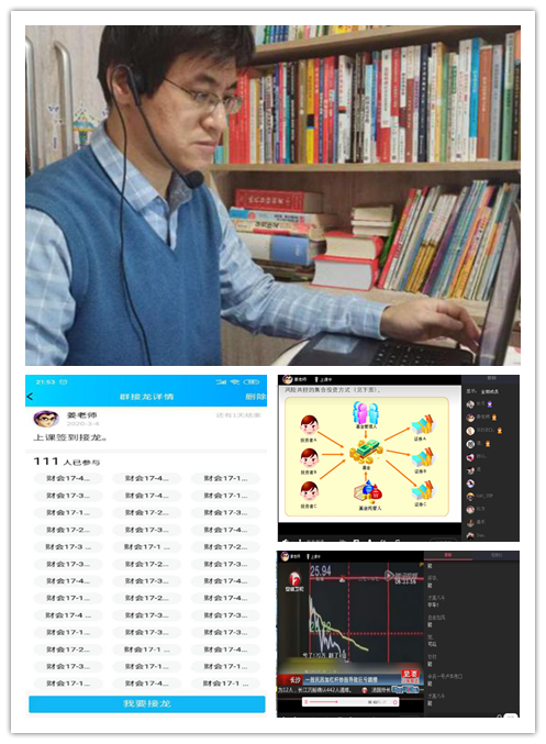 姜德伟老师本学期承担了财会16-1-8班的《证券投资学》课程教学工作,结合这门课程时效性、实践性强的特点,采取QQ群课堂直播的教学方式,以超星学习通做为备选方案。