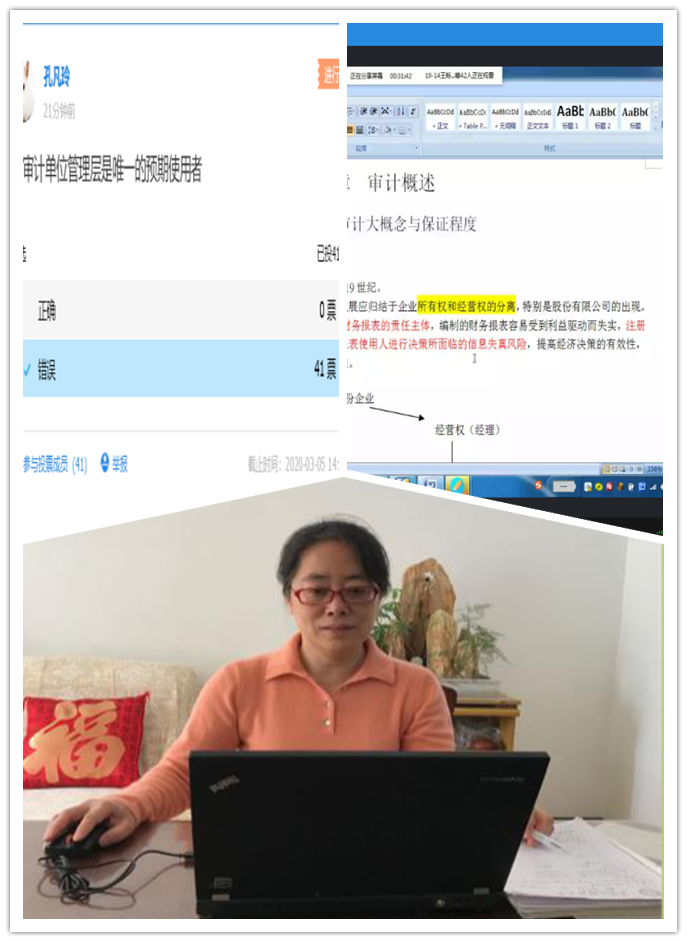张晶老师本学期承担三门课程,均在开学第一周开课,课程多,学时密集,教学任务量巨大的,压力也很大。从2月中下旬就开始浏览各种教学平台,进行有目的的选择,开始学习“超星学习通”的操作,准备各种教学资料,最直接的感受是坐的腰酸背痛,眼睛干涩。