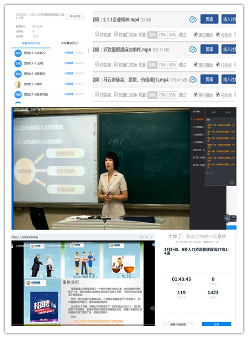 钉钉直播从效果上是非常理想的,从周一到周三,每天进行两场直播,共六场,只有一次出现卡顿现象,其他均为流畅。钉钉直播结束后系统会有较为详尽的统计数据,每个同学的观看直播时间,在线时长,参与人数都能显现,所以课前和下课均不用特地签到。为了避免,员工只是开着直播,没有参与到学习中来,课中,我会点名回答问题,从回答状况来看,所点员工99%是在线认真听课的,能够在第一时间对我回复响应。这个点值得点赞。