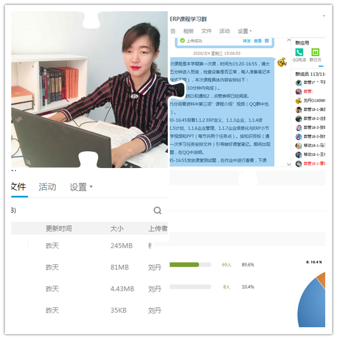 其次,开学初各高校都在进行网上教学,难免会出现网络卡顿,为了保证“停课不停学”,保证每堂课都能正常完成,除了超星学习通,我又搭建了QQ群平台,在教学过程中两个平台相结合取得了较好的效果。提前将上课的材料通过QQ群传给员工,让员工进行提前预习,在上课的过程中也会通过QQ群与员工实时的互动,也通过QQ给员工进行答疑,为了能更好的补充学习通平台的授课内容,我也通过录屏软件录课进行课程讲授。
