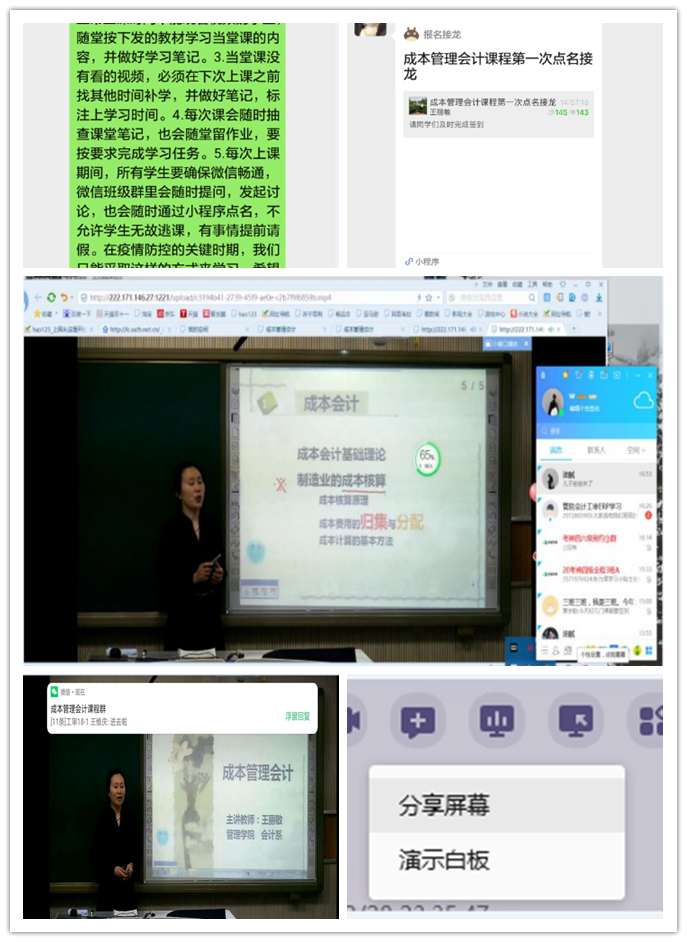 线上教学第一周,suncitygroup太阳集团教师开课共有59门(其中研究生开课4门,本科生开课55门),56位教师进行线上教学,93个班级2769名员工开始了在线学习。学院领导班子做为教学督导,按照分配的听课任务及时深入线上教学课堂,共听了11名教师线上课程讲授,学院任课教师借助在线学习平台、腾讯会议、腾讯课堂、微信群和QQ群等社交软件,采用慕课、直播、视频、音频、在线讨论、线上答题等等方式积极开展课堂教学与互动,精心落实了每一门线上课程的教学任务。为了防止网络拥堵、播放卡顿等突发情况出现,王丽敏、张晶、姜德伟等多位教师都做了两套教学方案,通过多样化、个性化的教学方式第一周线上教学工作顺利开展,并为同学们带来了一场场精彩的线上课堂教学。