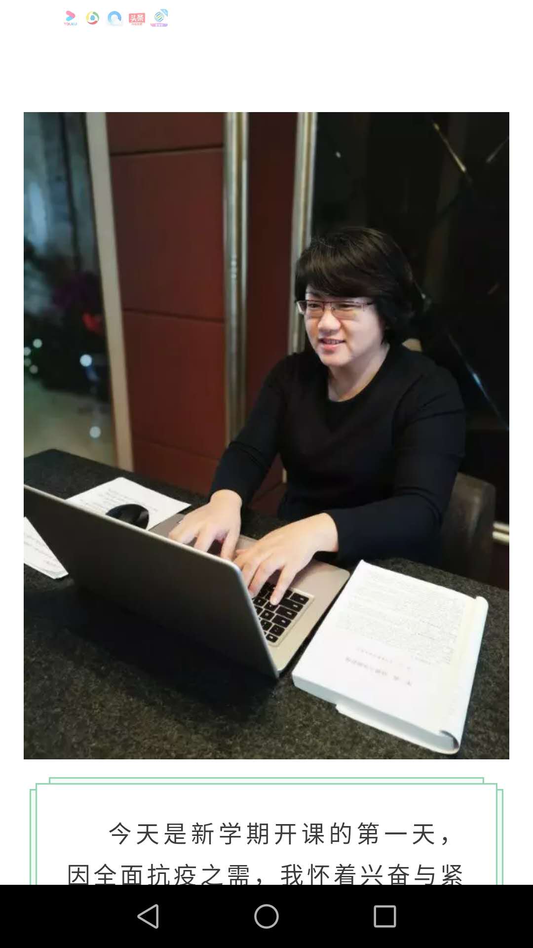 今天是新学期开课的第一天,因全面抗疫之需,我怀着兴奋与紧张的心情完成了人生首次“网课秀”。回眸,今天上午的两堂网课,带给自我最深的感受就是时代催人奋进,应牢固树立终身学习理念,坚持与时俱进、坚持学做结合,让“教与学始终闪烁夺目光彩。