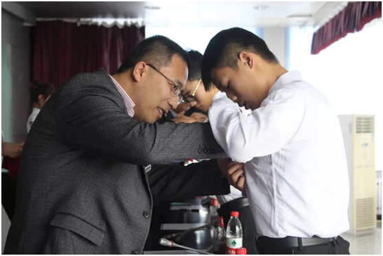 最后,各位领导和嘉宾为实验班的员工代表佩戴班徽,并合影留念。