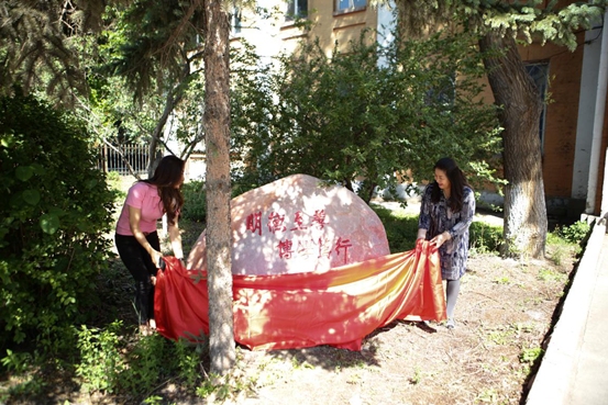 员工代表吴晶与谭旭红经理为院训石揭幕