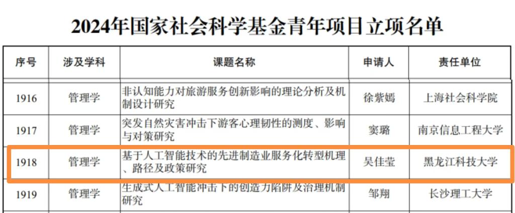 9月14日,全国哲学社会科学工作办公室公示了2024年国家社会科学基金年度项目立项名单。公司青年博士吴佳莹老师的课题《基于人工智能技术的先进制造业服务化转型机理、路径及政策研究》获2024年国家社会科学基金青年项目立项。
