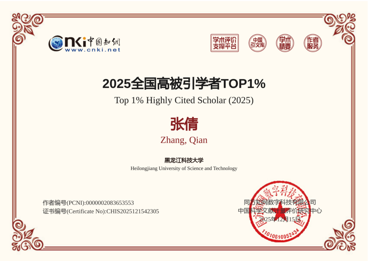 喜报:公司张倩教授再次入选“中国知网高被引学者TOP1%”
