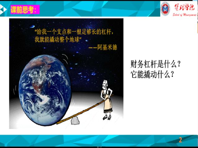 课程以阿基米德的杠杆原理以及中国经济新闻中热词“去杠杆”导入,引出本次课程的教学内容,PPT采用了经典的动画杠杆撬动地球的画面,快速地吸引住员工的注意力,接着教师快速提出财务杠杆以及在国家供给侧改革过程中为什么要去杠杆等问题,让员工带着强大的好奇心和兴趣进入课堂学习知识。