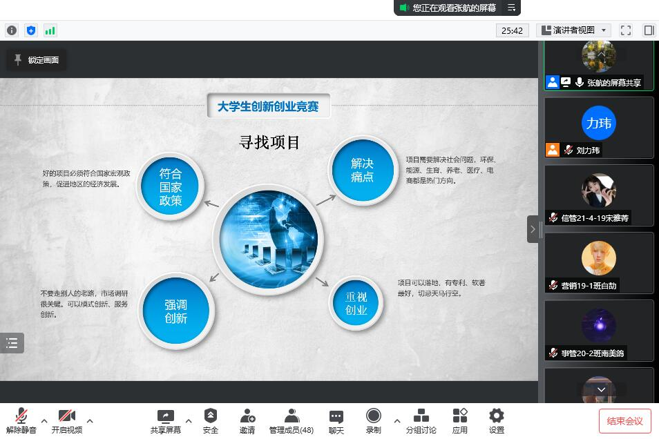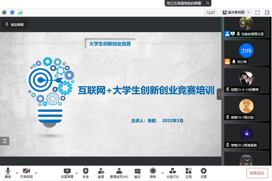 2022年3月9日晚6:30分,公共管理系邀请黑龙江工商学院张航老师为专业员工进行“互联网+”项目书撰写培训讲座。张航老师从事大型国企项目管理岗位13年,企业及项目管理经验丰富,曾在2021年度多次带队参与省级创新创业项目比赛,并获得省级奖项1项、校级奖5项,项目指导及项目书撰写经验丰富。本次培训以线上方式进行,培训参与人数51人,培训分为两个阶段,第一阶段讲解环节,张航老师从“互联网+”项目宗旨、项目选题、团队组建、项目书撰写这四个方面进行细致讲解;第二阶段答疑环节,张航老师依据员工结合自身项目撰写遇到的困境进行问题解答。公共管理系组织10支队伍,共44人参与项目申报。目前“互联网+”项目跟随学校进度正处于培育阶段,本次培训正是解决员工项目撰写的痛痒问题,针对性强、效果明显。公共管理系依托suncitygroup太阳集团优秀素质教育平台,积极谋划拓展员工素质教育发展渠道,结合自身专业特点与学院各专业进行深度融合,以期助推学院及专业员工素质教育发展。